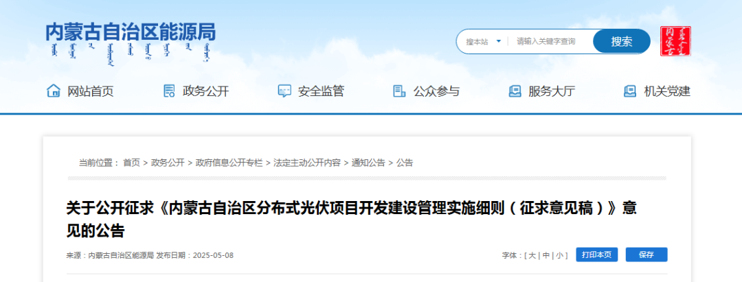 - 2025-05-24《内蒙古自治区分布式光伏项目开发建设管理实施细则(征求意见稿)》发布